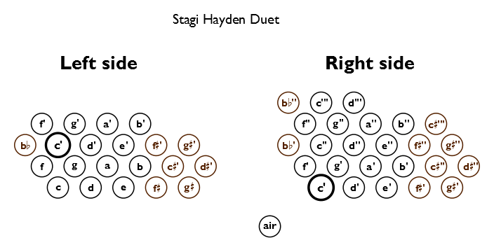 Stagi Hayden Duet(Learn more about our Stagi tuning and maintenance process.)This concertina has the standard 46 button Hayden layout with a range from the tenor C to the B above middle C on the bass side, and middle C to the high D (3 octaves above middle C) giving it almost an octave of overlap (see note layout). Tuned to a'=440hz. Measures 7-½" across the flats, with mahogany ends, plastic buttons, 8-fold bellows, leather hand straps, with case. Video. New |