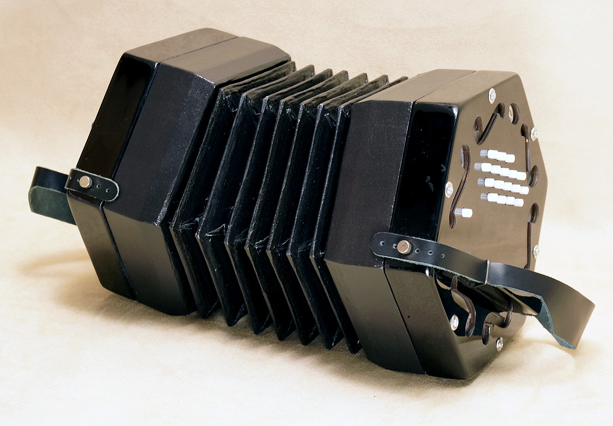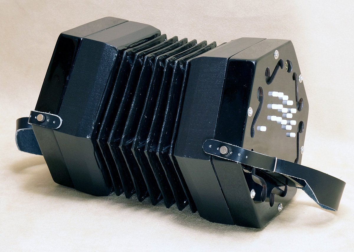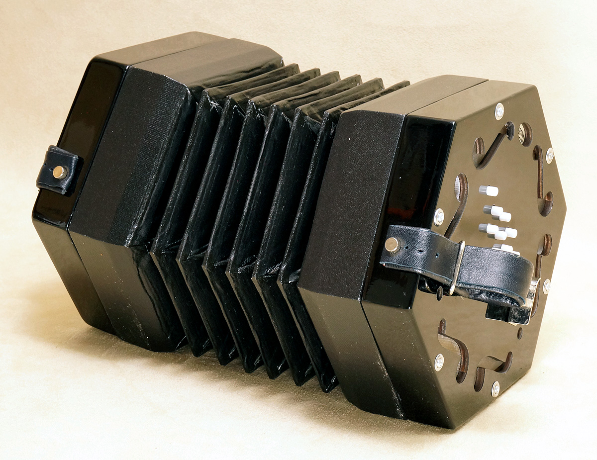 Concertina Connection Rose45-key treble, serial #166. Natural finished cherry ends, metal buttons, riveted action, Italian accordion-type reeds, and leather Wakker 6-fold bellows. Range: g - a3. With unfitted hardshell case. Video. New |
