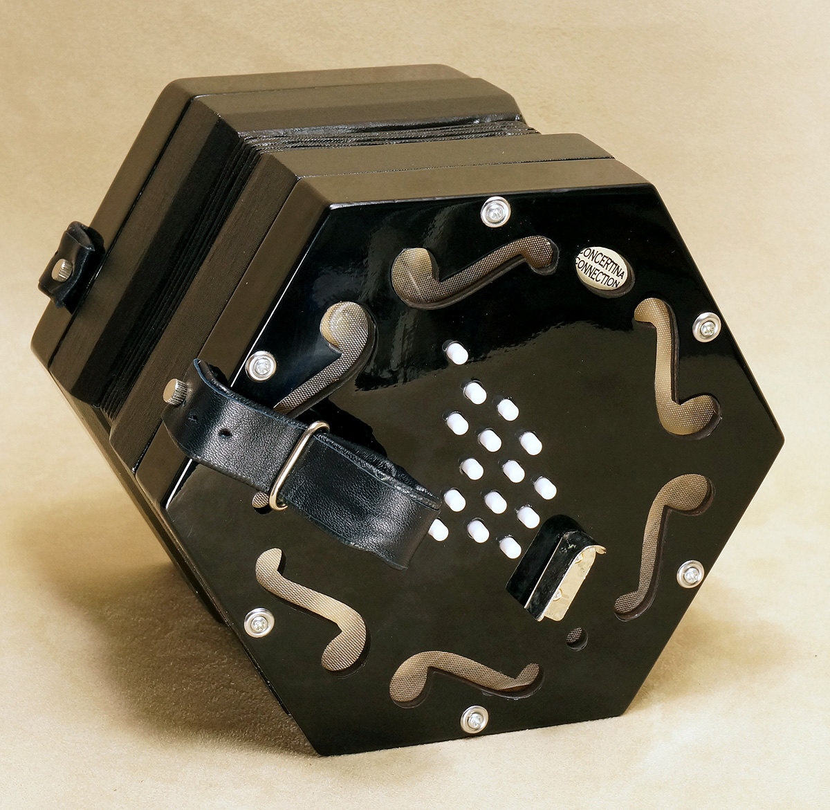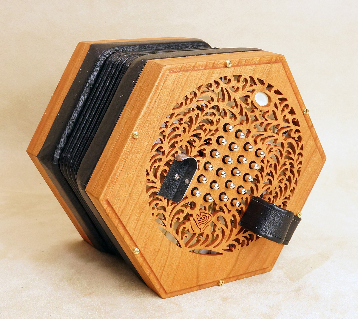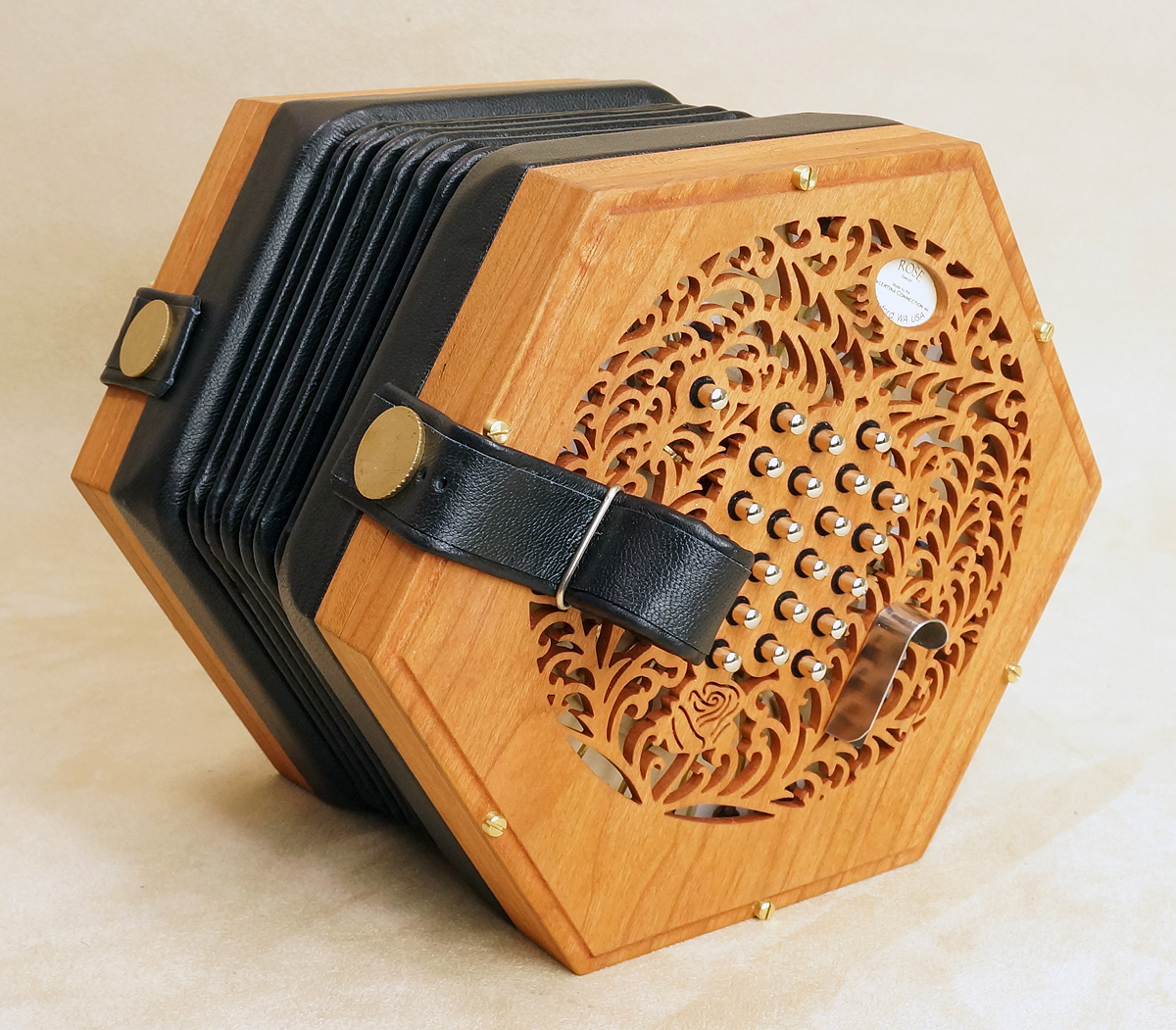 Concertina Connection Rose45-key treble, serial #166. Natural finished cherry ends, metal buttons, riveted action, Italian accordion-type reeds, and leather Wakker 6-fold bellows. Range: g - a3. With unfitted hardshell case. Video. New |