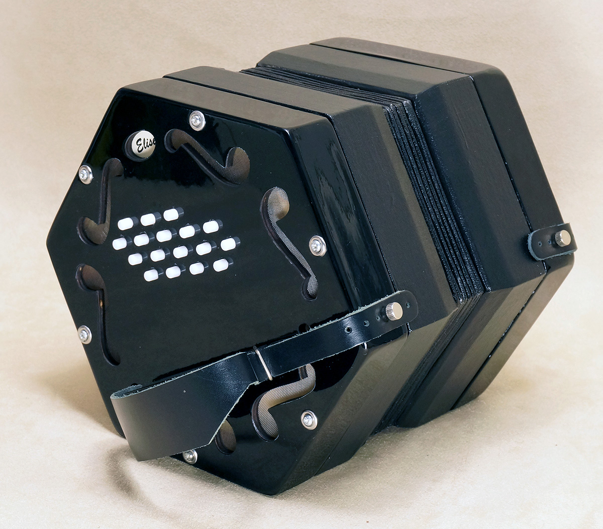 Concertina Connection Elise34-key Hayden duet, with traditional riveted action, 7-fold bellows, Hayden-specified keyboard slant and spacing (see note layout). Package includes soft case and a book written specifically for the instrument. Video. |