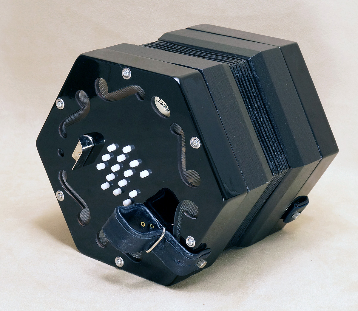 Concertina Connection Jack30-key baritone with a 2½ octave range. Fully chromatic. Black celluloid finish, white plastic buttons, 6-fold bellows. Outfit includes a soft case and a tutor written specially for this instrument. Video. |