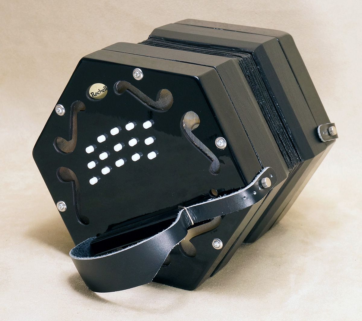 Concertina Connection Rochelle30-button, key of C/G. Black celluloid finish, white plastic buttons, riveted action, 7-fold bellows. Outfit includes a soft case and a tutor written specially for this instrument. Video. |