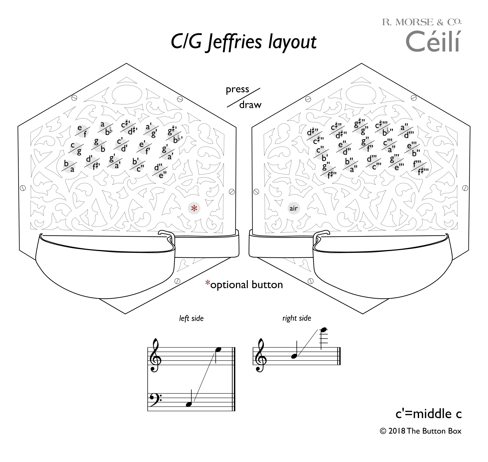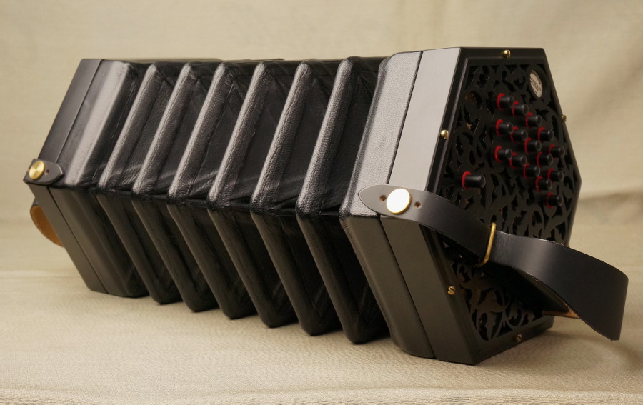 | Buttons: | 30 (option of left-hand thumb drone for additional charge). Made of black Delrin®, 1/4" across with slightly domed tops, offering comfort over many hours of playing. Natural felt bushings contribute to a smooth and quiet action. Raised air button. |