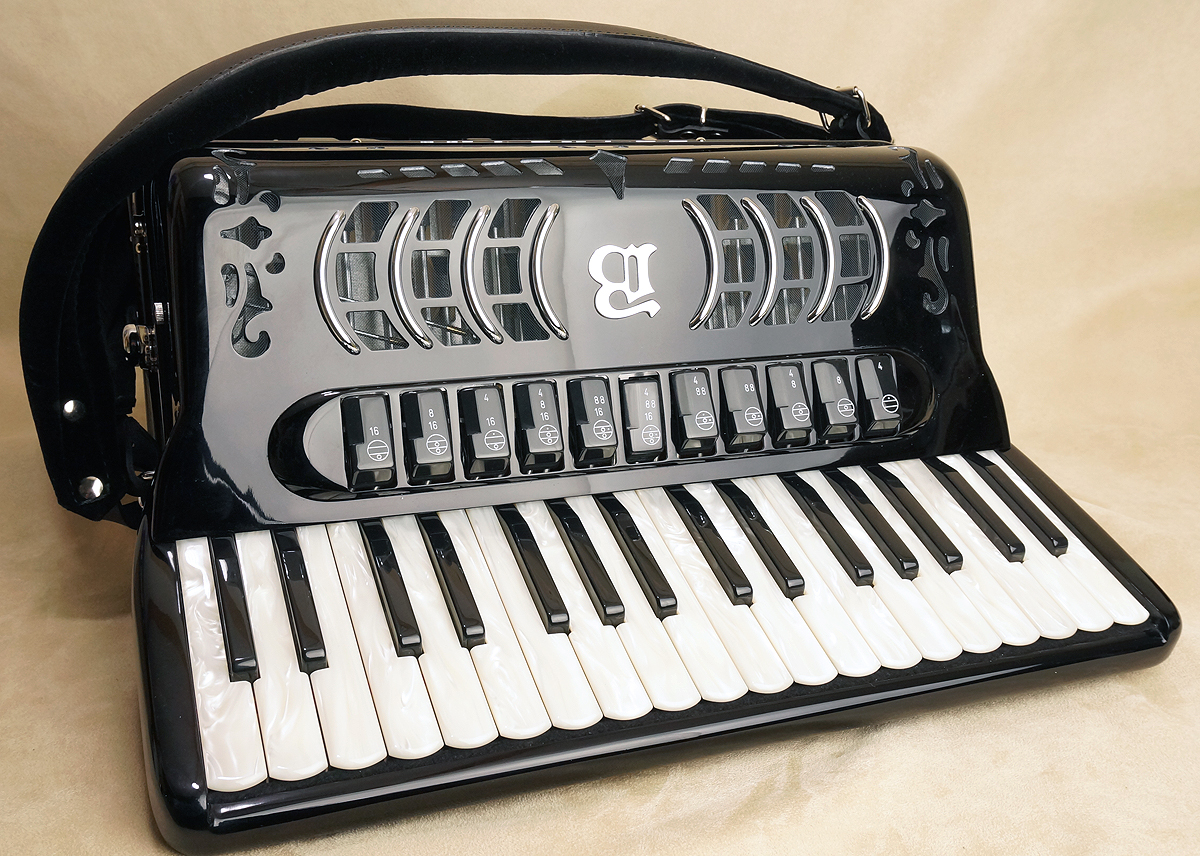 Brandoni 68C34 treble keys (g-e3), 96 bass buttons. 4/5 sets of reeds (LMMH or LMMM). 11 treble registers and 7 bass/chord registers. Choice of liberty or classic design, or infinity design (with 'infinity' reeds). 16" keyboard. 20.25 lbs. With backpad, deluxe straps, and rolling hardshell case. |