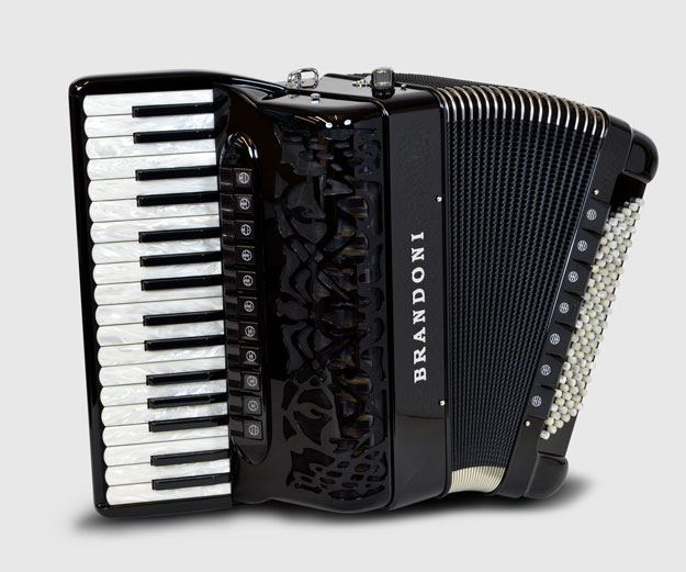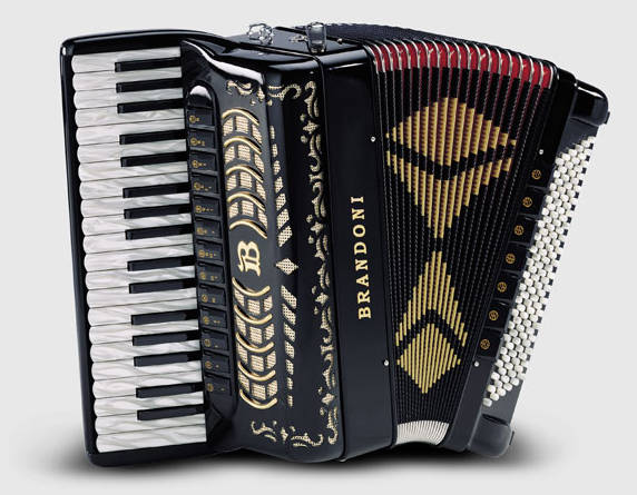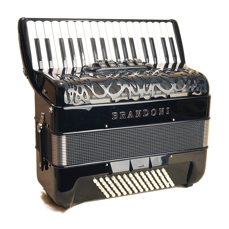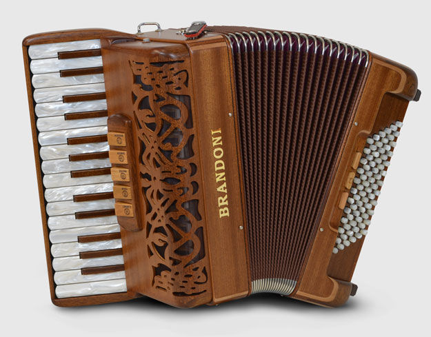 Brandoni 181WSolid mahogany from one of Italy's premier accordion makers. 5-row treble keyboard with 62 treble buttons (37 notes) from g - g3. 2/4 sets of handmade reeds, available either octave tuned (LM) or tremolo tuned (MM). 3 treble switches. 60 bass buttons. Natural finish mahogany or dark stained mahogany. 13.6 lbs. Case and straps included. Video.
