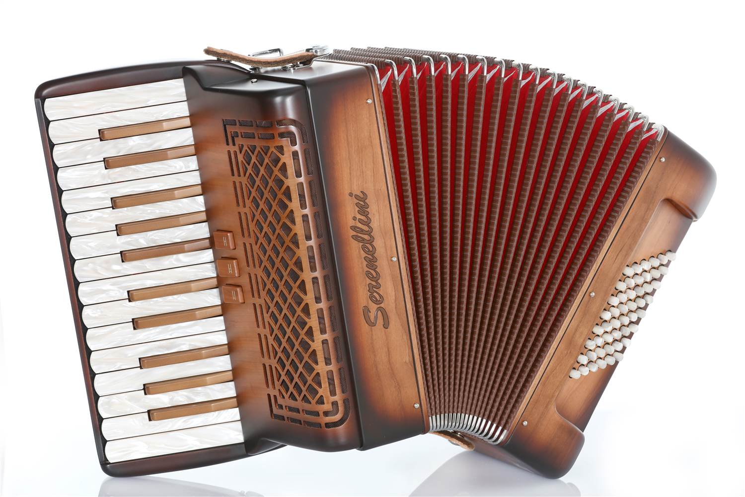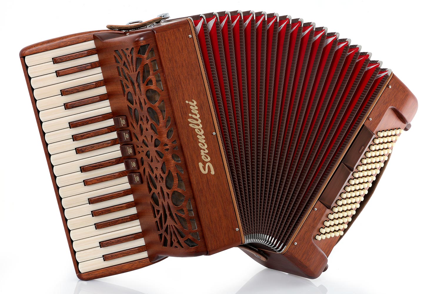 Serenellini Cassotto Opera 41 2+2120 bass, 41 treble, 4/5 sets of special handmade reeds (Artigiana) with a double tone chamber, 13/7 switches plus palm master. Choice of solid cherry or mahogany with natural finish. Full-size keyboard. 25.6 lbs. With case and straps.