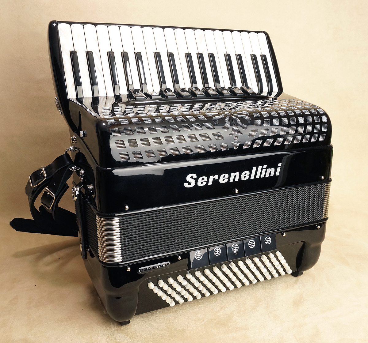 Serenellini Cassotto Imperator Gold 2+2120 bass, 41 treble, 4/5 sets of special handmade reeds (Artigiana) with a double tone chamber, 15/7 (or 11/7) switches plus palm master. Full-size keyboard. 25.8 lbs. With case and straps.