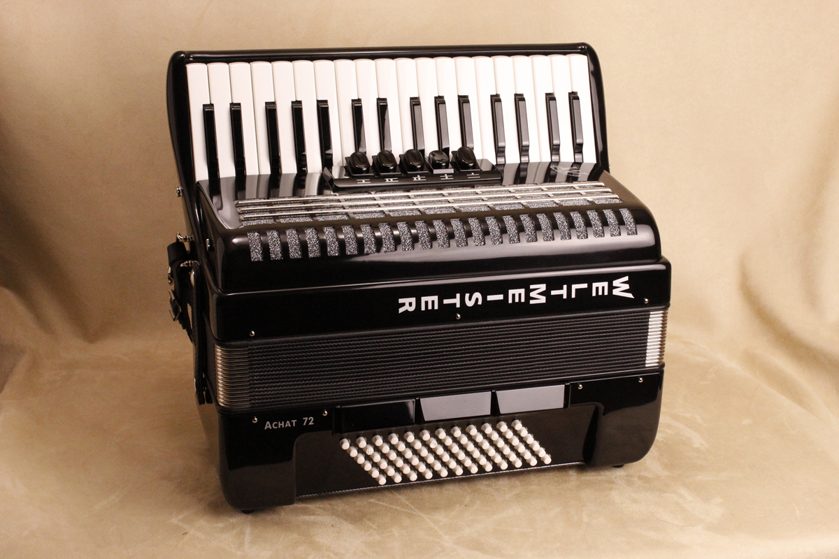 Weltmeister Achat 72 New low price!72 bass, 34 treble (g-e3), 3/4 reeds (LMM), 5/3 switches, full-size keys, 18 lbs. Available in a variety of colors. With straps and a hard case. Video.