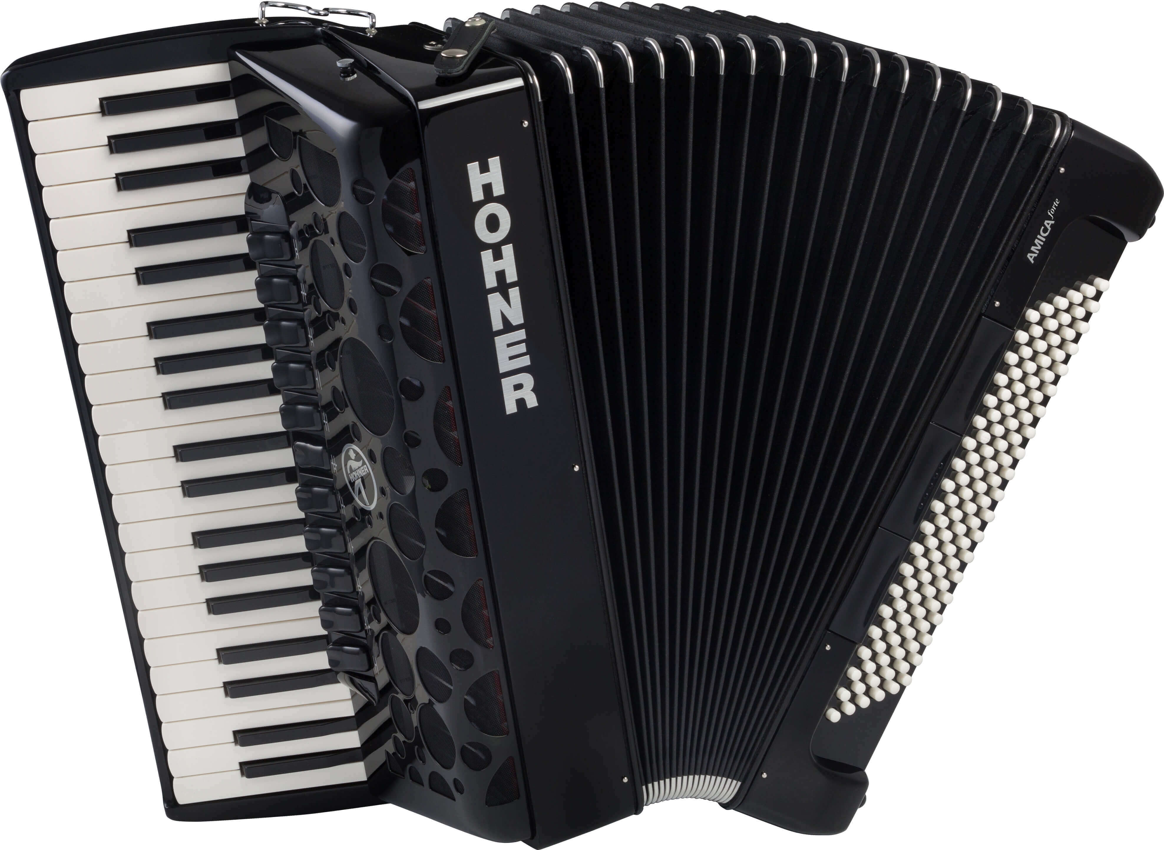 Hohner Amica Forte IV 120120 bass, 41 treble (f-a'''), 4/4 sets of reeds (LMMH), 11/3 registers, 19.2” keyboard, 21.6 lbs. Black finish. |