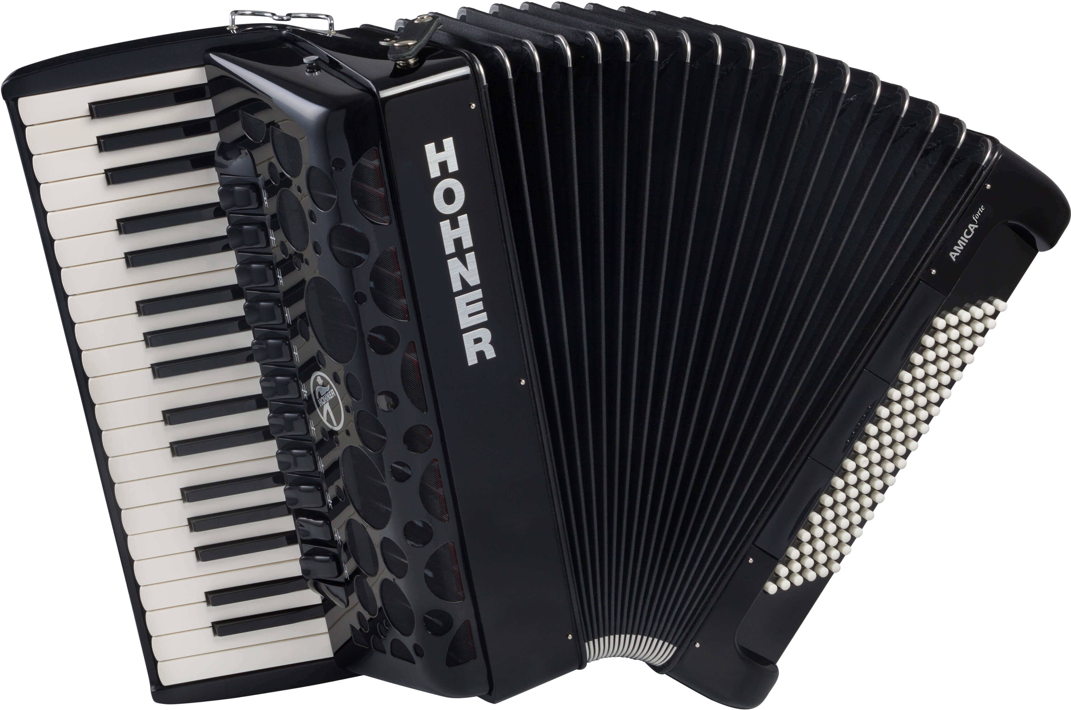 Hohner Amica Forte IV 9696 bass, 37 treble (f-f3), 4/4 sets of reeds (LMMH), 11/3 switches. 20.1 lbs. Black finish. Comes with straps and a rolling hard shell case. |