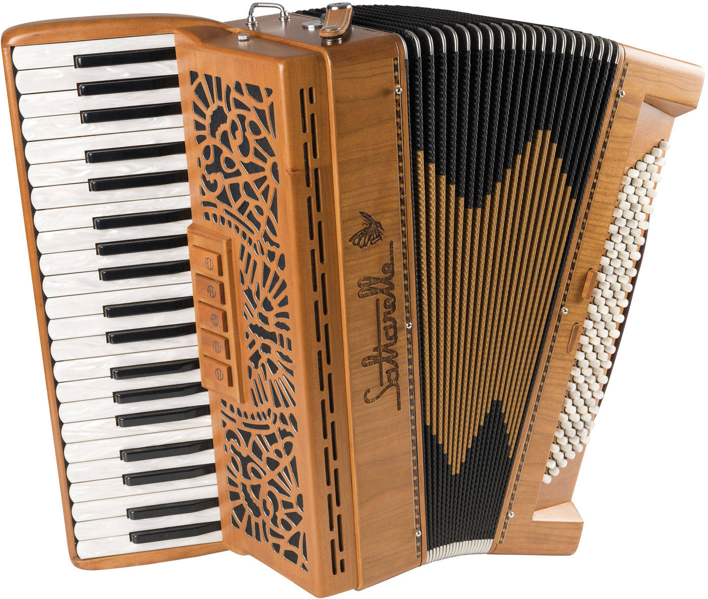 Saltarelle ArcadiaSaltarelle's new compact 96-bass chromatic model. 4-row with 56 treble buttons (43 notes), 3 sets of reeds and 5 switches located behind the treble keyboard. 96 bass buttons with 4 sets of reeds and 5 switches. Handmade reeds. Natural finish cherry/walnut. Specify c-griff or b-griff. Case and straps included.