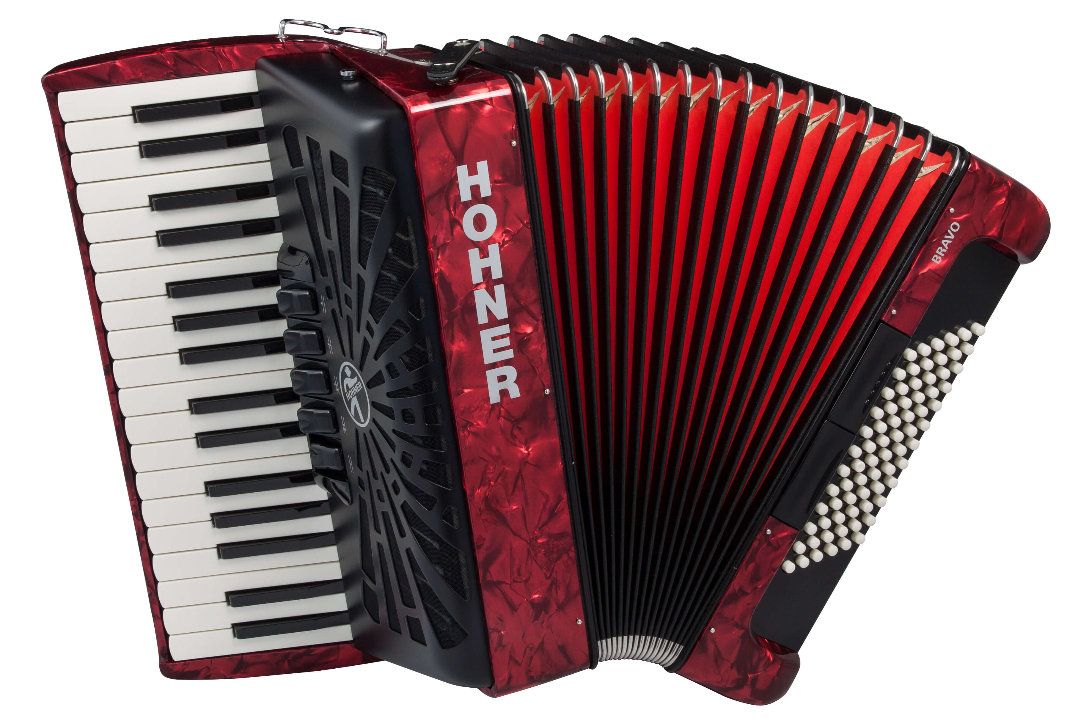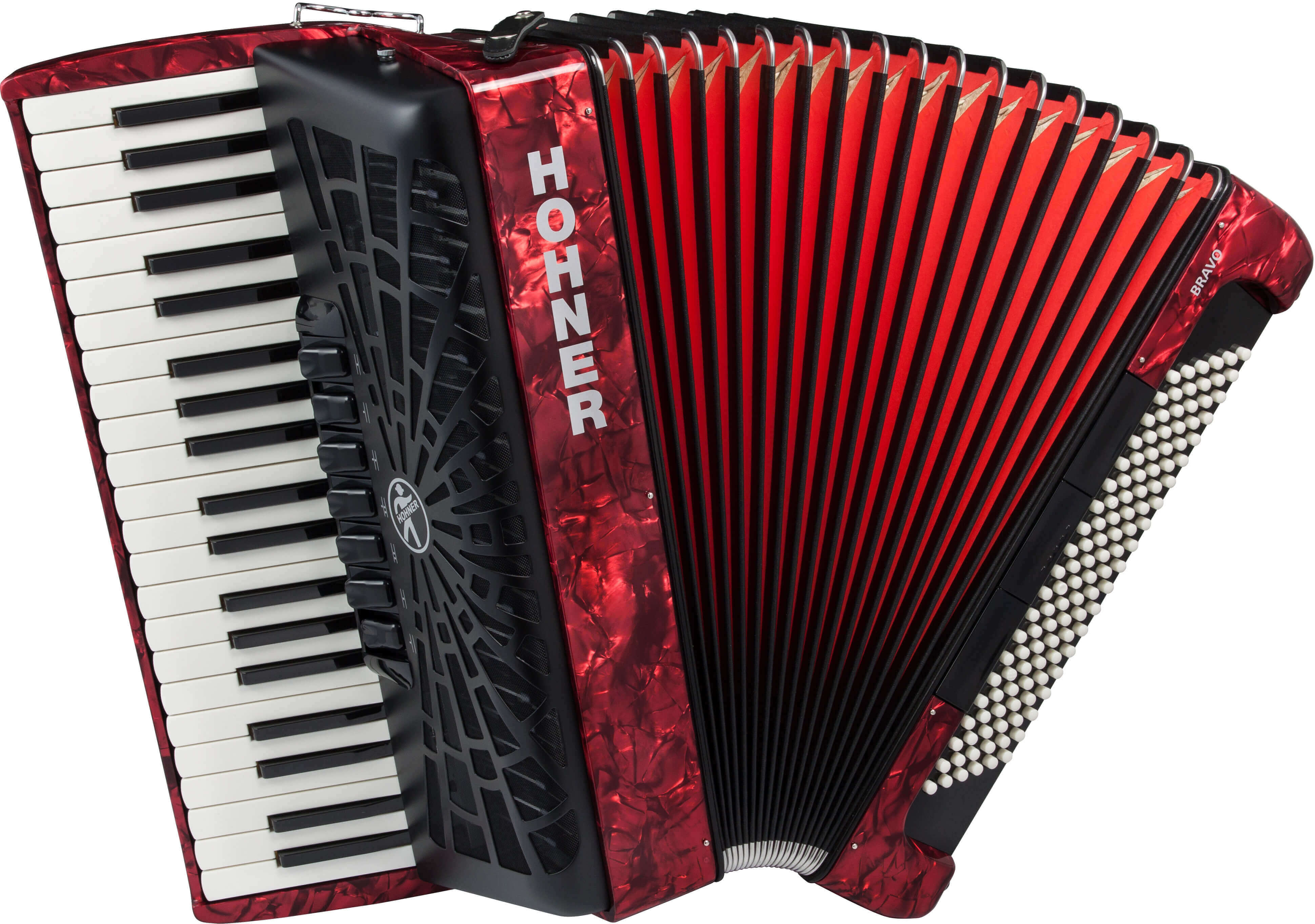 Hohner Bravo III 9696 bass, 37 treble (f-f3), 3/4 sets of reeds (LMM), 7/3 switches, 17.5” keyboard, 19 lbs. Black or red pearl finish. Comes with straps and a soft case. |