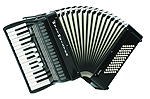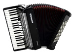 Hohner Bravo III 120120 bass, 41 treble (f-a'''), 3/4 sets of reeds (LMM), 7/3 registers. 19.2” keyboard, 20.25 lbs. Black or red pearl finish. Comes with straps and a soft case. |