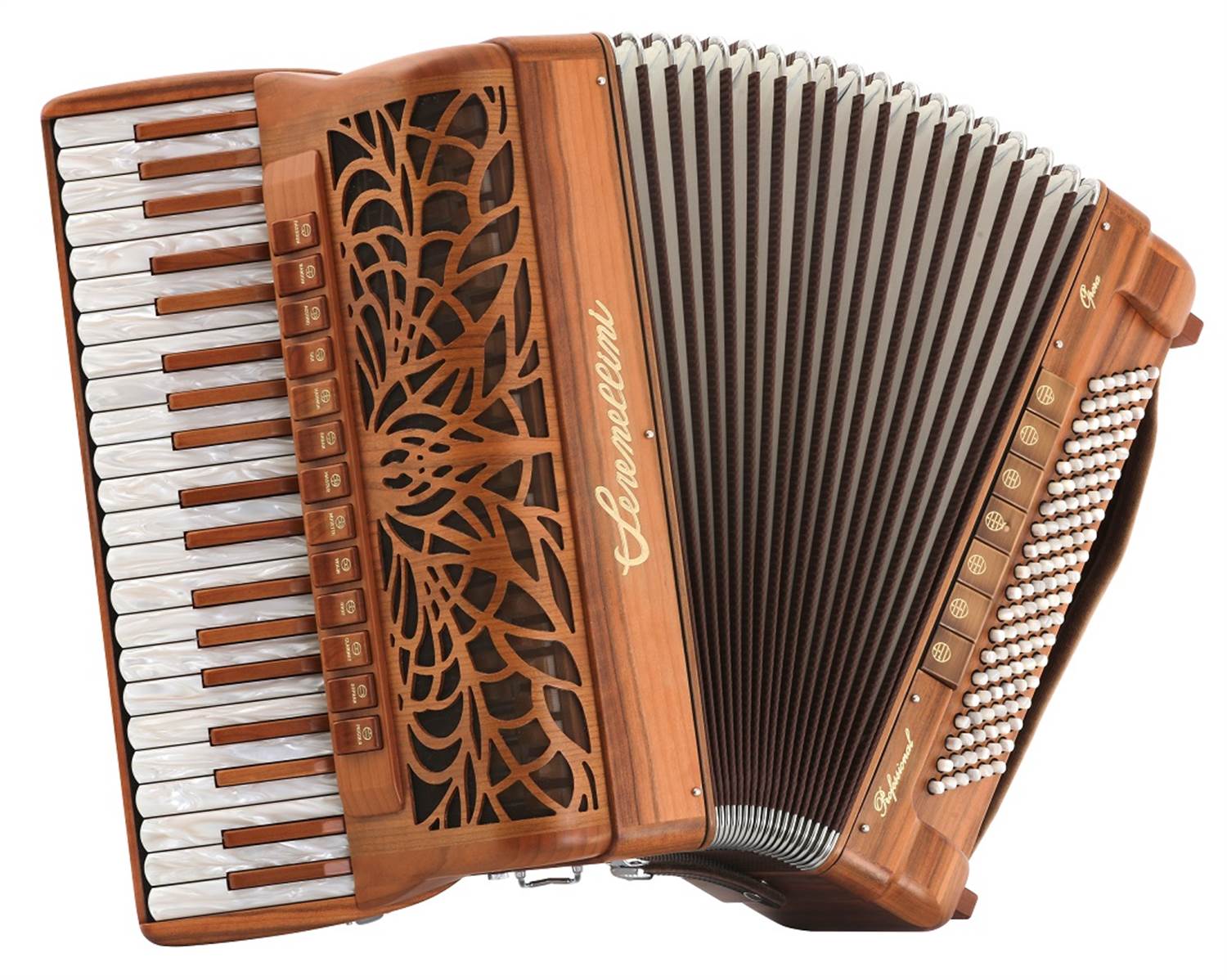 Brandoni 68W34 treble keys (g-e3), 96 bass buttons. 4/5 sets of Artigiana Professional handmade reeds (LMMH or LMMM). 11 treble registers and 7 bass/chord registers. Solid mahogany construction with natural finish or dark stain. Choice of liberty or classic design. 16" keyboard with pearl naturals and mahogany sharps. Pearl bass buttons. 20.25 lbs. With backpad, deluxe straps, and rolling hardshell case. |