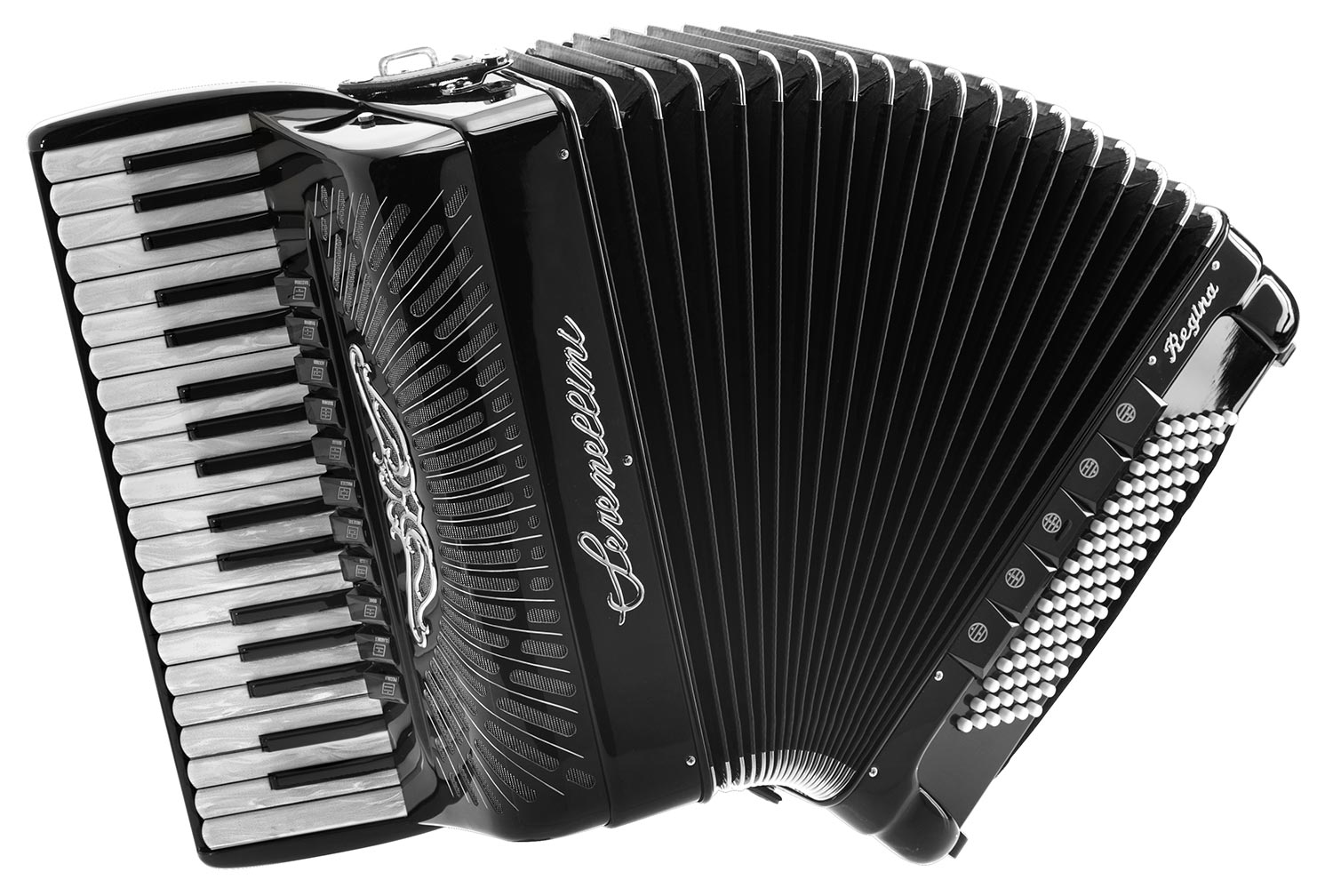 Serenellini Cassotto Regina Silver 2+2Full-size 96 bass model. 37 treble, 4/5 sets of special handmade reeds (Artigiana) with a double tone chamber, 11/5 switches. Pearl keys and bass buttons. Measures 17½" x 7¾". 24.2 lbs. With deluxe case and straps.