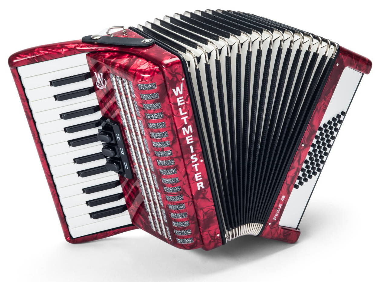 Weltmeister Perle New low price!48 bass (6x8), 26 full-size treble keys (b - c3), 2/3 reeds, 3 switches, 12" keyboard, 12.1 lbs. Available in a variety of colors. With straps and a hard case. Video.